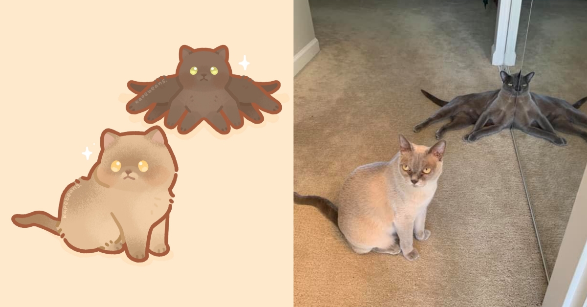 到底是貓咪還是蜘蛛?透過鏡子反射而擁有八隻腳的喵喵有夠好笑!感覺一旁的貓咪頭上都浮現了問號:「本喵難道看見了奇行種?」