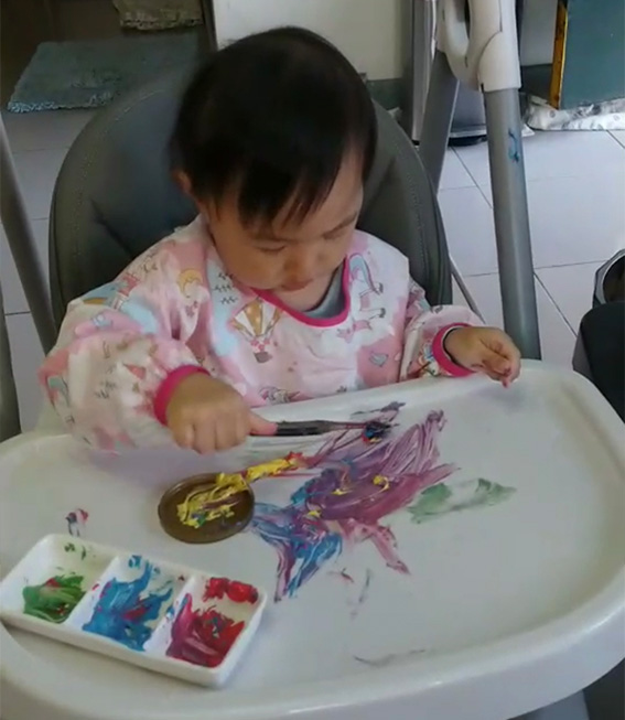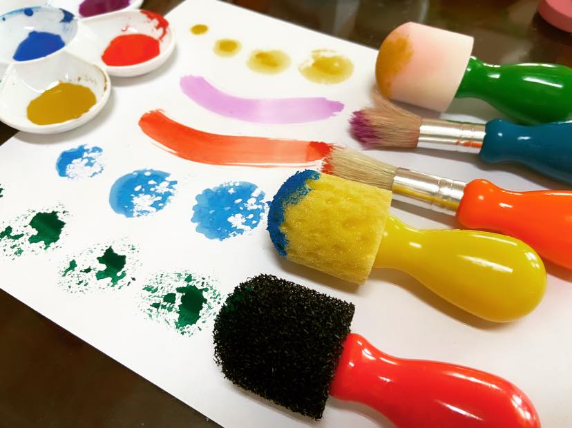 嬰幼兒一直到幼稚園,可能都還無法俐落的使用筆、水彩筆,所以如果是針對2、3歲以下的嬰幼兒,就不必過度勉強他們用什麼方式作畫。可以用與生俱來的雙手、手指,或是拿牙刷、棉花棒、海綿、印章、噴瓶用噴的……,用各式各樣的道具沾取顏料,製造不同的作畫效果。這也是發揮創意的其中一個方法喔~