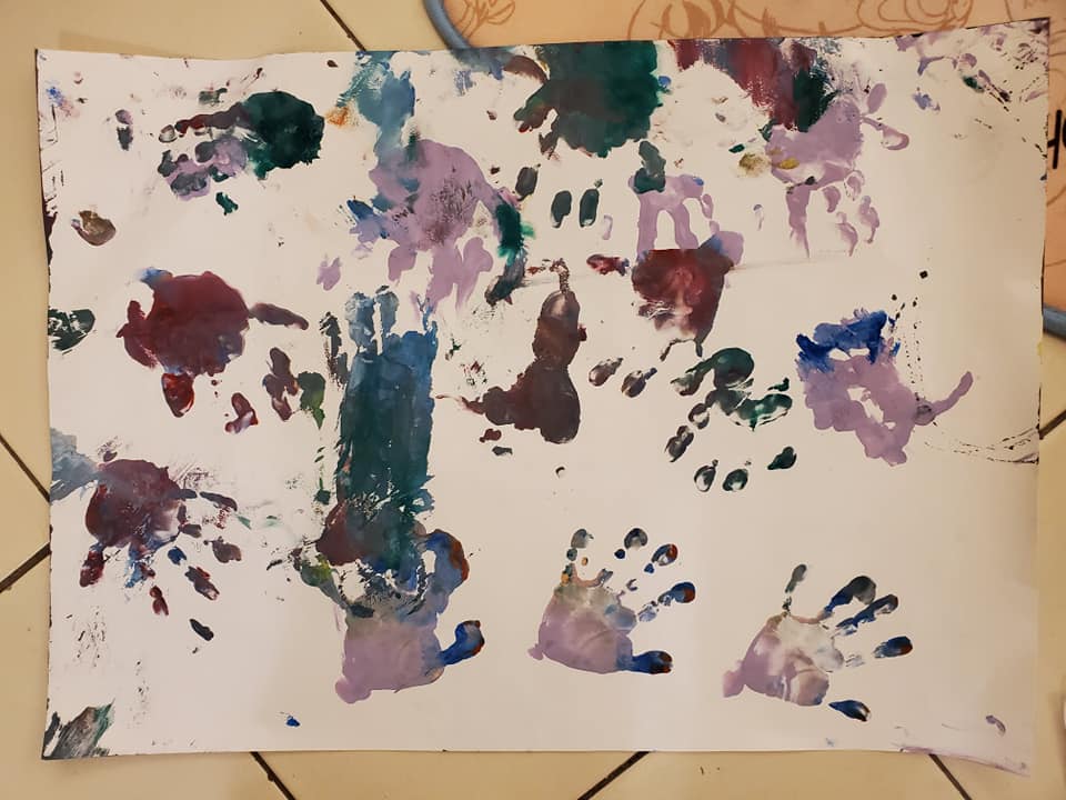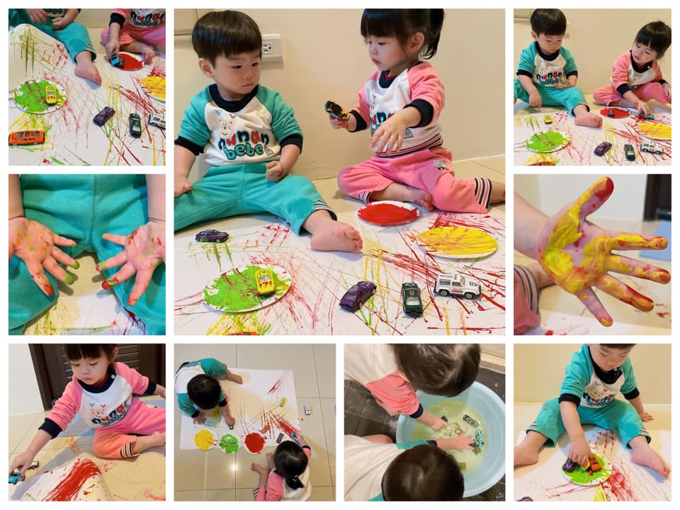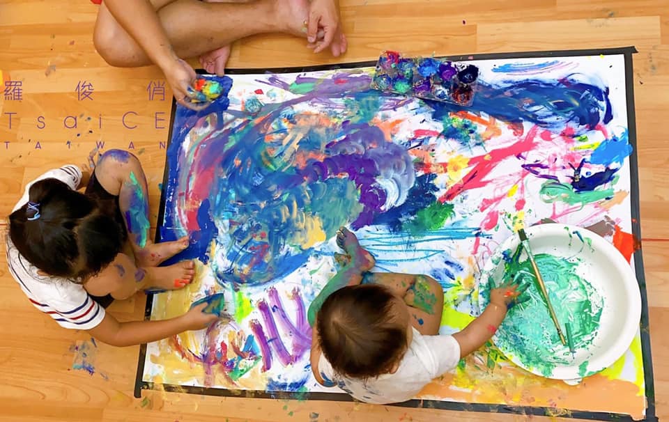 除了以上事前準備工作,有陪小孩畫畫過的媽媽,還提醒各位:「媽媽衣服也要脫光」因為一定會遭殃阿!不管是小孩玩到一半過來摸媽媽、抱媽媽,或是蹲久了也想坐在五顏六色的地上......如果不想洗衣服洗那麼累,就也跟著穿舊衣服或是脫光(穿拋棄式內褲),跟著一起玩吧!