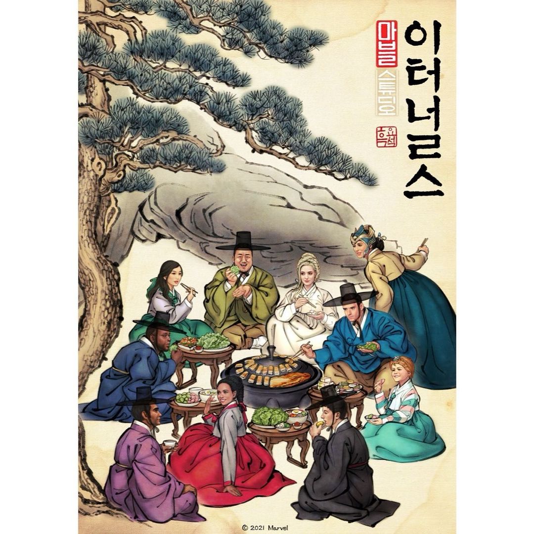 漫威超級英雄電影《永恆族》現正熱映中,「地表最強大叔」馬東石的加盟也讓觀眾眼睛為之一亮,近期漫威更與插畫家WOOH NAYOUNG合作推出韓版海報,充滿濃濃韓國味,不僅主角們都換上韓服,還圍在一起吃生菜包肉!