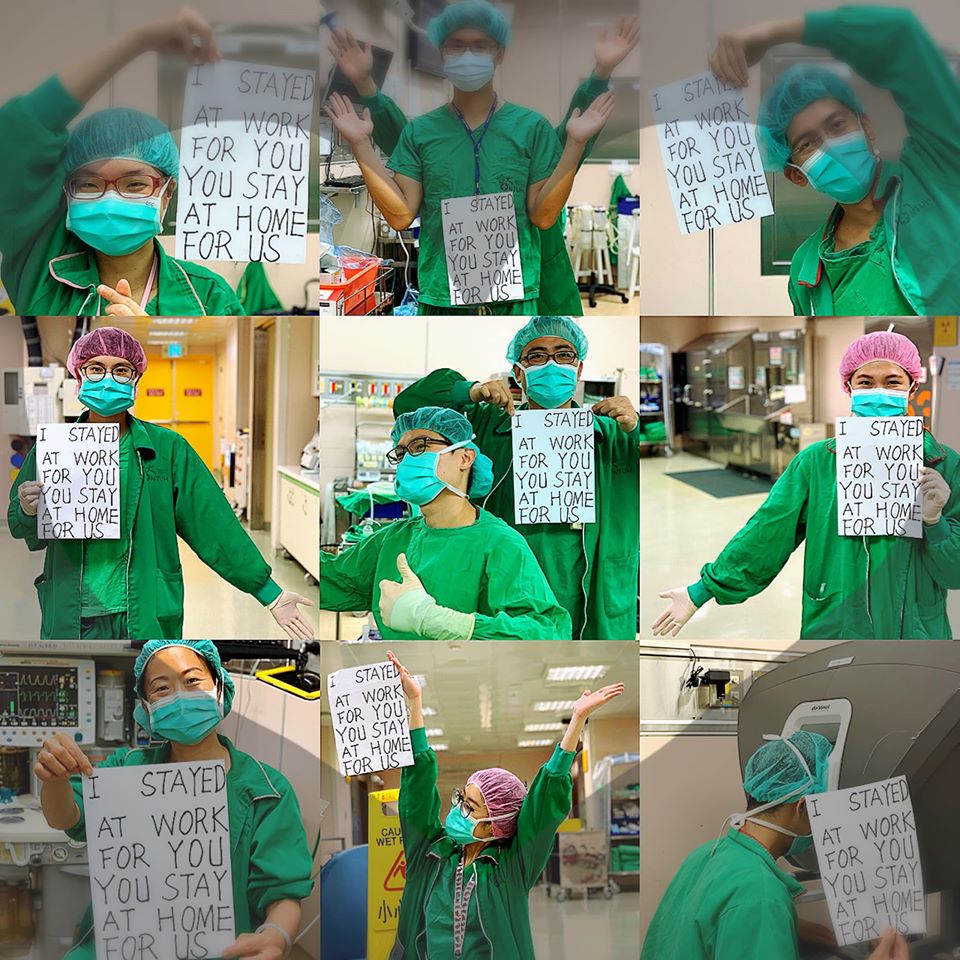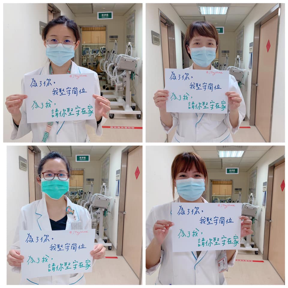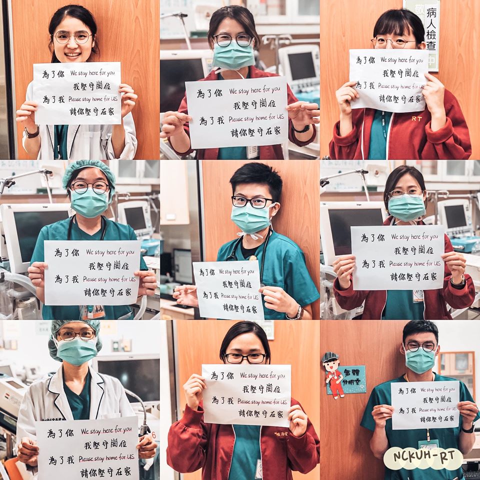 隨著新冠肺炎(武漢肺炎)疫情日趨嚴重,在還沒爆發社區感染之前,最大的疫情漏洞為境外移入感染,如果在此時還有堅持要出國的民眾,真的會造成社會大眾的困擾,不只造成防疫團隊的壓力,更增添醫療團隊的辛勞!除了國外醫護人員貼出「I stayed work for you. You stay at home for us.」標語之外,台灣的醫護人員也紛紛響應!