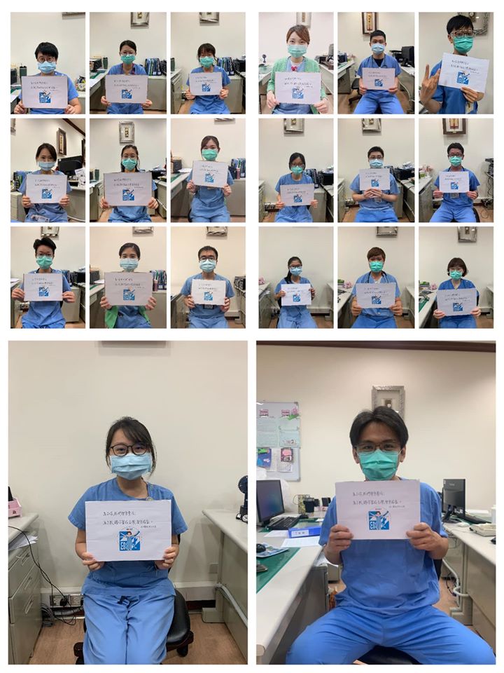 而義大醫院的呼吸治療師更自製新的看板,加上不同的字體與義大醫院的Logo,每位醫護同仁都相當辛苦地在為台灣的疫情貢獻生命,身旁的醫護朋友都在加班,隨著確診人數每天都兩位數地在增加,更要體會他們的辛勞!
