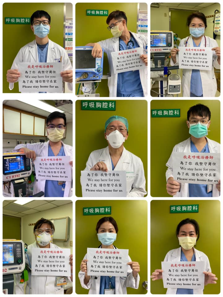 台北國泰醫院呼吸治療師在標語上多加了一行「我是呼吸治療師」,並在臉書表示「COVID-19,沒事待在家,待在家沒事」。圖片中帶著聽診器、護目鏡、N95口罩的醫生們紛紛拿著標語,希望大家共同守護台灣。(大家應該都知道N95口罩戴久了非常不舒服)