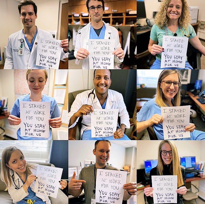 根據明尼蘇達州衛生部門發布的數據,該州的77例確診冠狀病毒病例中,有13名醫護人員,並持續增加中。依據這個結果,明尼蘇達州雅培西北醫院的醫生和護理師舉起標語「I stayed work for you. You stay at home for us.」請大家為了第一線的醫護人員著想,也保護好你自己,待在家!