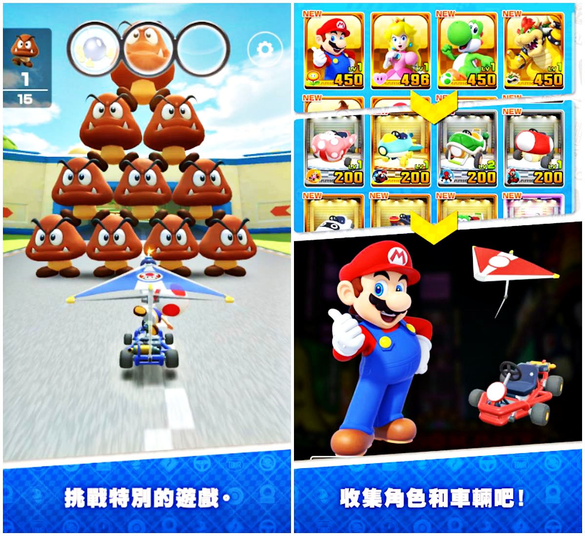 在開始尬車之前,玩家可以自行選擇喜歡的角色、車輛與滑翔翼,於原作中登場的經典角色都將出現在《Mario Kart Tour》中,例如碧姬公主、耀西等等。