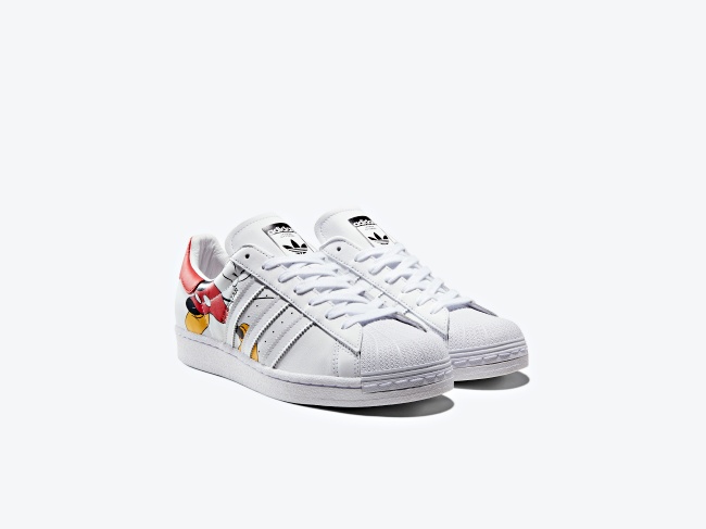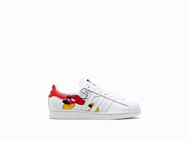 引發熱議(怒氣)的這款話題小白鞋,以磨砂顆粒質感的皮革鞋面打造而成,鞋面本來應該乖乖待著的主角米奇,居然偷跑了(笑)!可以看到Stan Smith鞋型的黑白版本米奇以及Superstar鞋型上那隻彩色米奇,從側面看只剩下身體,頭部直接延伸成鞋後LOGO,米奇跑太急的臉蛋要在另一側才能看到,原來這款主題就是「Out of Office」,趕去過年假的匆忙身影幽默定格全印上~