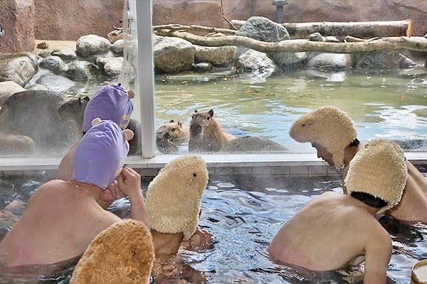 在王國溫泉裡泡湯的遊客,可以隔著玻璃「賞豚」,此外還設有一個區域,能夠讓大家在沒有玻璃隔著的戶外近距離觀察牠們,遊客可以看見 3 到 4 隻水豚和自己一樣泡在水中、舒適地瞇起眼睛,不說還以為是在照鏡子(?),照片中調皮的遊客們還戴著水豚帽偽裝成間諜水豚,讓真水豚都驚呆啦!