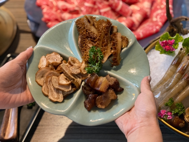 另外隨餐還有「彩蔬寶盒/奶油萵苣+白玉蘿蔔」擇一、「鮮蝦滑/墨魚滑/青花椒麻口水雞」擇一、「老油條/手感拉麵/寬粉」擇一、「冰鎮青花烏龍/葡萄柚果汁/秘製酸梅汁」擇一,再加上集結牛肚、牛筋和大腸頭的「牽腸掛肚滷味拼盤」,好吃到令人吮指回味呢!(飽嗝)