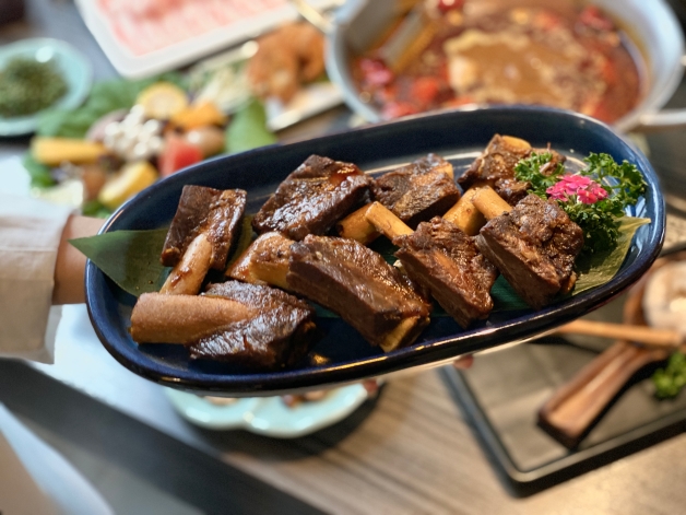 如果喜歡啃骨頭的妞妞們,建議可以點「青花椒麻肩小排」,使用主廚獨門滷汁細細燉煮,享用前放入麻辣鍋涮約30秒的時間,起鍋後先是香麻四溢,骨肉分離的完美入味直接入口即化,鮮麻而不燥烈的美味,意圖使人再續點一盤,八隻鮮嫩的小排等著大家下肚!
