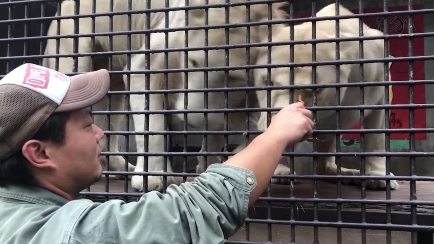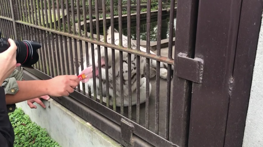 看影片就知道結果了吧~飼育員先把肉泥拿給白老虎吃吃看,果然只要是大貓都沒辦法抗拒肉泥的誘惑,牠兩手一攤躺在籠子前霸氣地舔舐著肉泥,看來一條應該沒辦法滿足牠的味蕾;隨後再讓孟加拉虎試試看,雖然沒有像白老虎一樣毫無節制,但牠也是舔得不亦樂乎!(孟加拉虎:白色那隻舔得太沒節操)