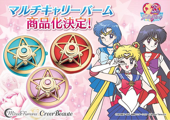 不只彩妝品,最近官網也宣布通訊器造型的保濕潤唇膏商品化確定的消息,預計發售時間為8月下旬。第1彈總共有水手月亮、水手火星跟水手水星3種,依照各個戰士的形象使用不同的顏色與保濕成分,除了能夠使用在唇部,也能塗抹於全身喔!