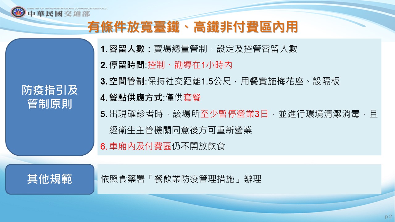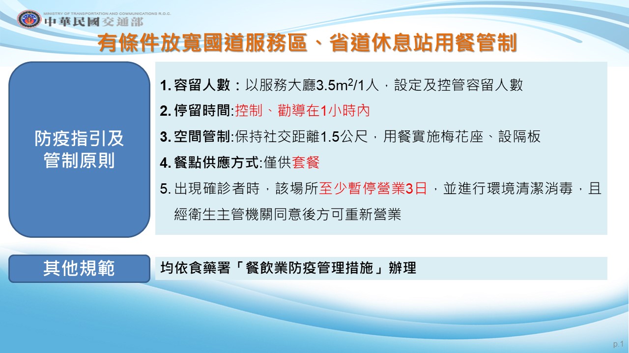 而交通部也針對駕訓班、台鐵及高鐵還有服務區都有適度的開放政策,遊樂設施的部分,必須進行人流管制,水域活動設施原則上不開放。