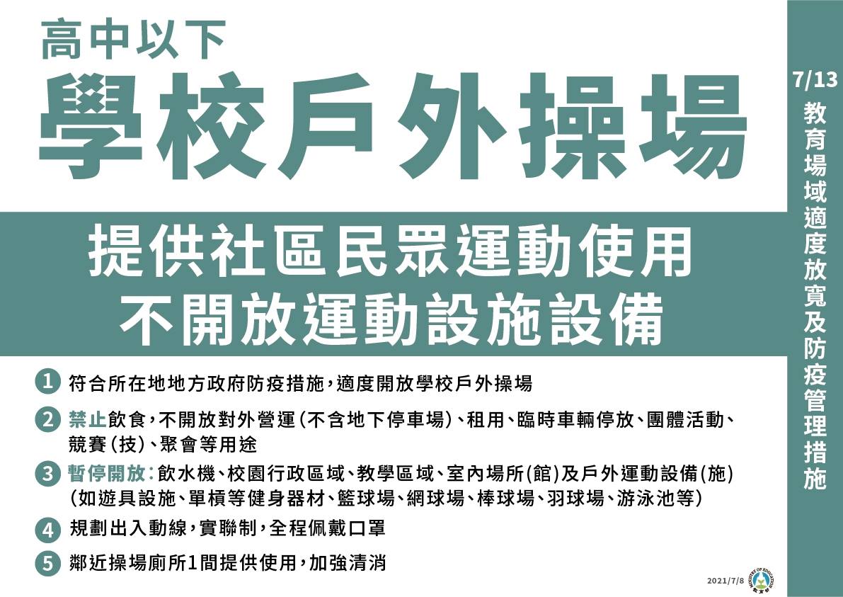 戶外:國家公園、國家風景區、遊樂園區、休閒農場、森林遊樂區、植物園、文化園區、學校操場、駕訓班。但是山屋、生態保護區以及墾丁沙灘依然持續關閉。