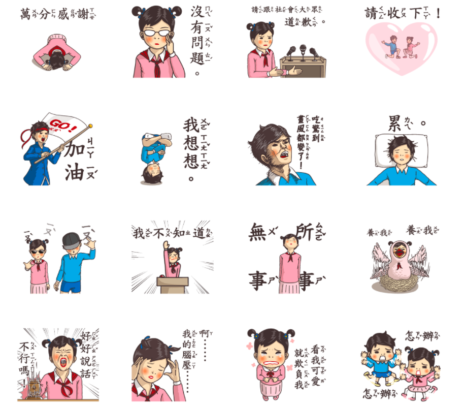 這次的貼圖,旁白所配的字和角色們所做的動作完全不相符,所以妞妞們也不用再思考,為什麼「我想想。」會變成盤腿頭轉的動作了......