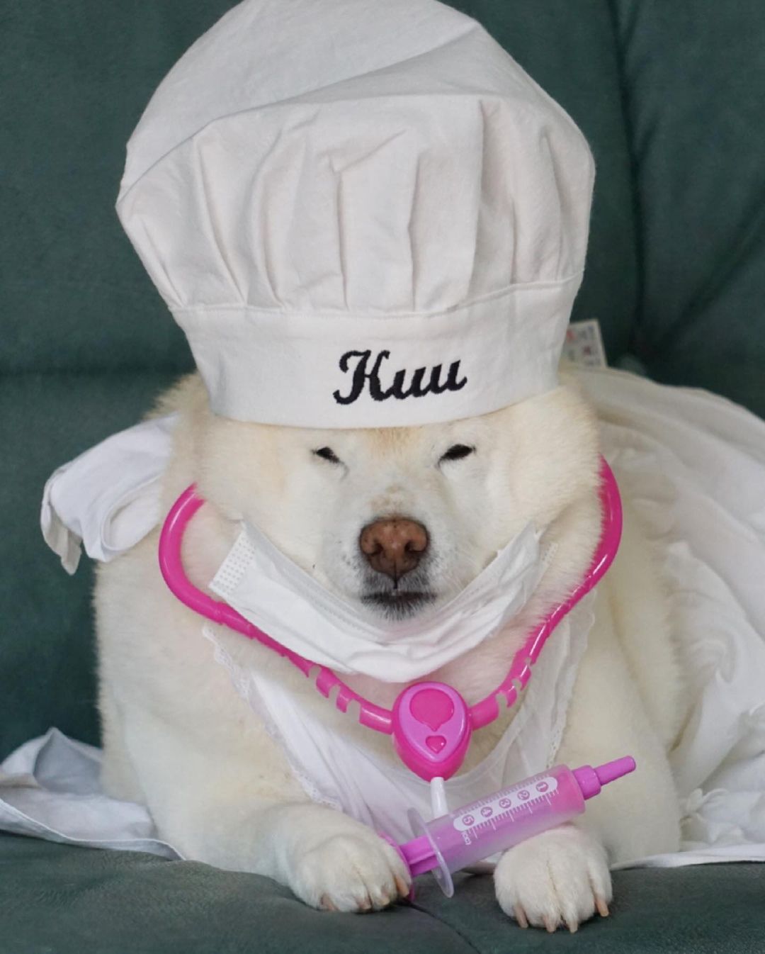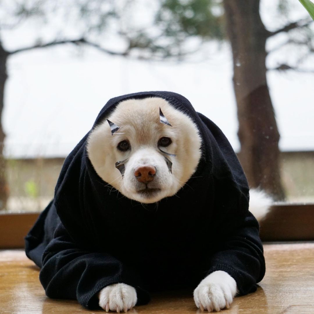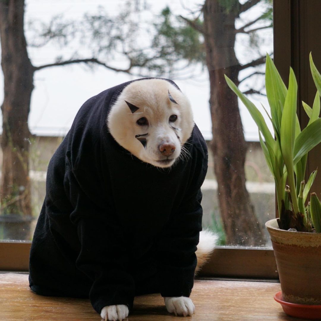 這隻來自日本的白柴柴名叫「空(くう,kuu)」,之所以取名叫空是因為主人在第一次見到牠時,牠發出「kuu~」的叫聲,於是飼主就幫牠取了個這麼可愛的名字!這次扮演了《神隱少女》中的無臉男,看牠眼神空洞又無靈魂的樣子,好像揣摩得還不錯耶!(之後可能還會有很多吉卜力工作室的裝扮!)
