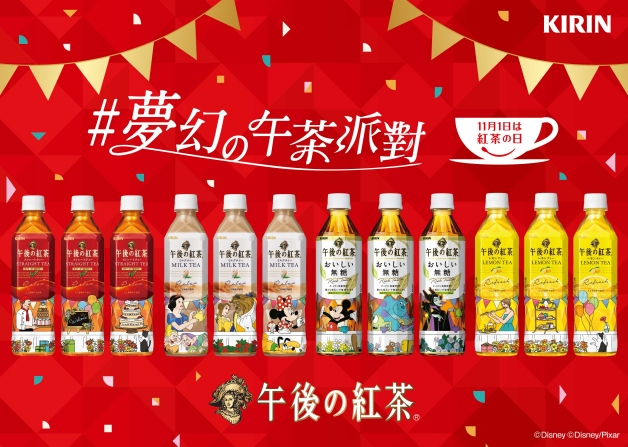 9月22日台灣的午後の紅茶才開賣「奇奇蒂蒂經典限定組玩偶」,沒想到最近台日又傳來重磅消息,為慶祝日本11/1「紅茶の日」,跟迪士尼合作推出「派對限定瓶」全套14款,罐身均穿上經典角色或午茶派對插畫包裝,每款皆可相互連接成下午茶派對場景,將不同故事線的角色包裝瓶排列一起 ,不僅經典角色米奇和米妮、唐老鴨和黛西躍上瓶身,就連《玩具總動員》、《怪獸電力公司》、《小飛象》、《阿拉丁》和《愛麗絲夢遊仙境》等也有登場!