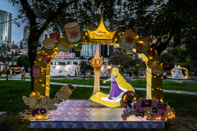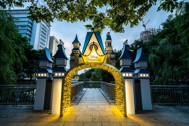 「童話城堡」於萬坪公園九曲橋前,城堡高度約為4公尺高,主色調為「藍色」和「白色」相間,一秒讓人飛到迪士尼樂園,使用「華麗金色燈海」和「公主皇冠造型」進行點綴,妞妞們只要穿越這座魔法拱門,就能化身公主,一窺迪士尼的夢幻世界!