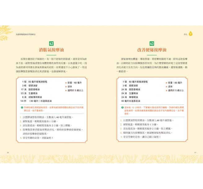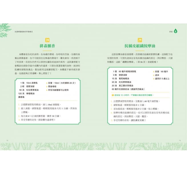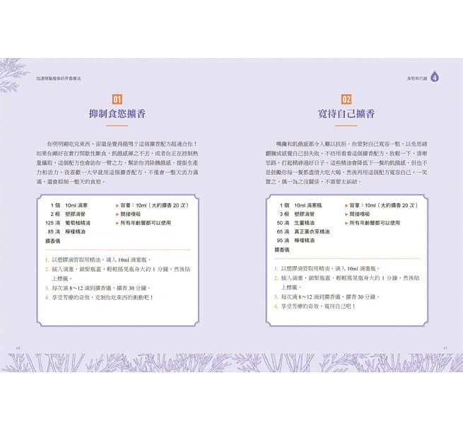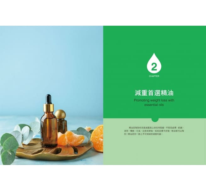 戒糖癮鼻吸棒、新陳代謝飆速滾珠瓶、啟動代謝擴香、燃脂按摩油、排毒滾珠瓶、纖體按摩霜、抗橘皮磨砂膏、改善便秘按摩油、揮別壓力滾珠瓶……書內收錄63款瘦身期間所需的有效天然精油配方,同時針對針對從來沒使用過精油的新手,詳細介紹安全稀釋的比例和精油使用法,早晚認真擦配方精油,搭配正常作息,多喝水,理想中的美麗體態離你不遠啦~