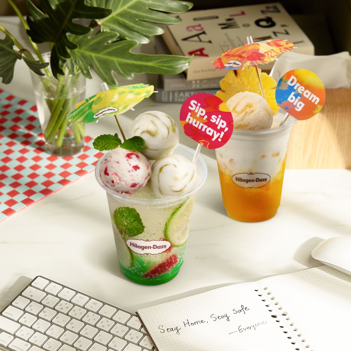 夏天怎麼能少了冰涼飲品呢?冰淇淋凍飲是Häagen-Dazs每年夏天的固定班底,7月1日起更加碼推出限定款飲品,讓大家來冰淇淋店也能帶微醺感的調酒回家!「鳳梨可樂達」將鳳梨可樂達冰淇淋混搭芒果雪酪,濃郁果香超級消暑;「草莓萊姆莫希朵」選擇了熱門的草莓冰淇淋搭配萊姆莫希朵雪酪,再加入清爽的氣泡水,清涼感瞬間湧上~