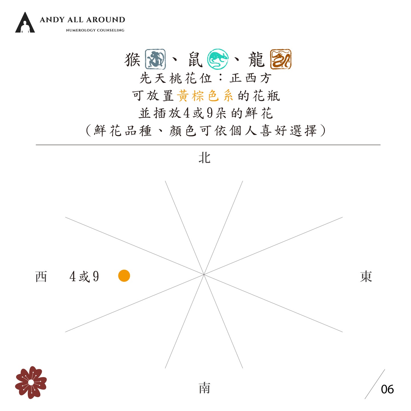 屬猴、鼠、龍的妞妞,地支三合為「申子辰合水」,先天桃花位就是正西方,可以放置黃棕色系的花瓶,並插放4或9朵的鮮花。