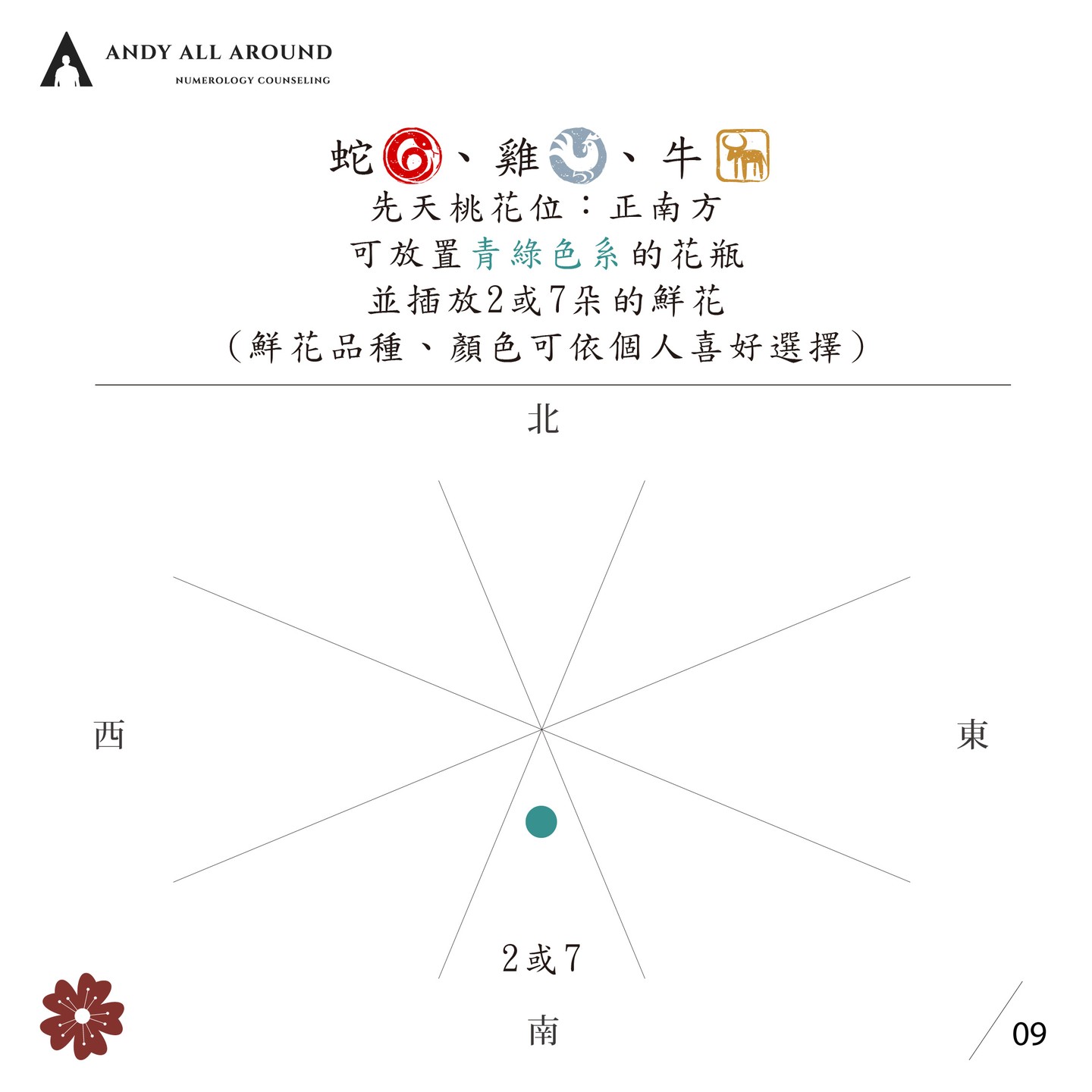 最後,屬蛇、雞與牛的妞妞們,先天桃花位的方向為正南方,先天桃花位在正南方,地支三合為「四酉丑合金」,適合放置青綠色的花瓶,插放2或7朵鮮花,而不管是哪個生肖,鮮花的品種和顏色選自己喜歡的就可以囉~