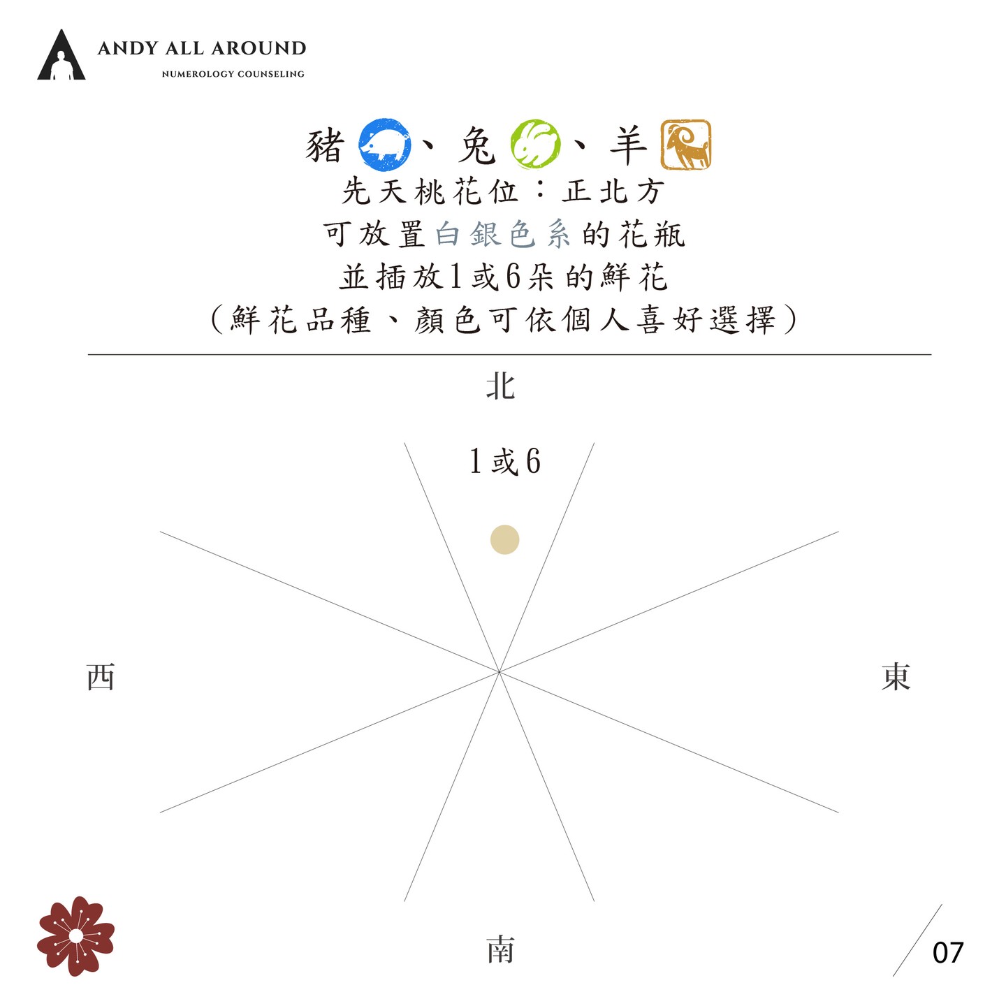 今年的兔年寶寶與屬豬、羊的朋友,地支三合為「亥卯未合木」,先天桃花位的方向為正北方,適合放置白色、銀色系的花瓶,並放上1朵或6朵鮮花。