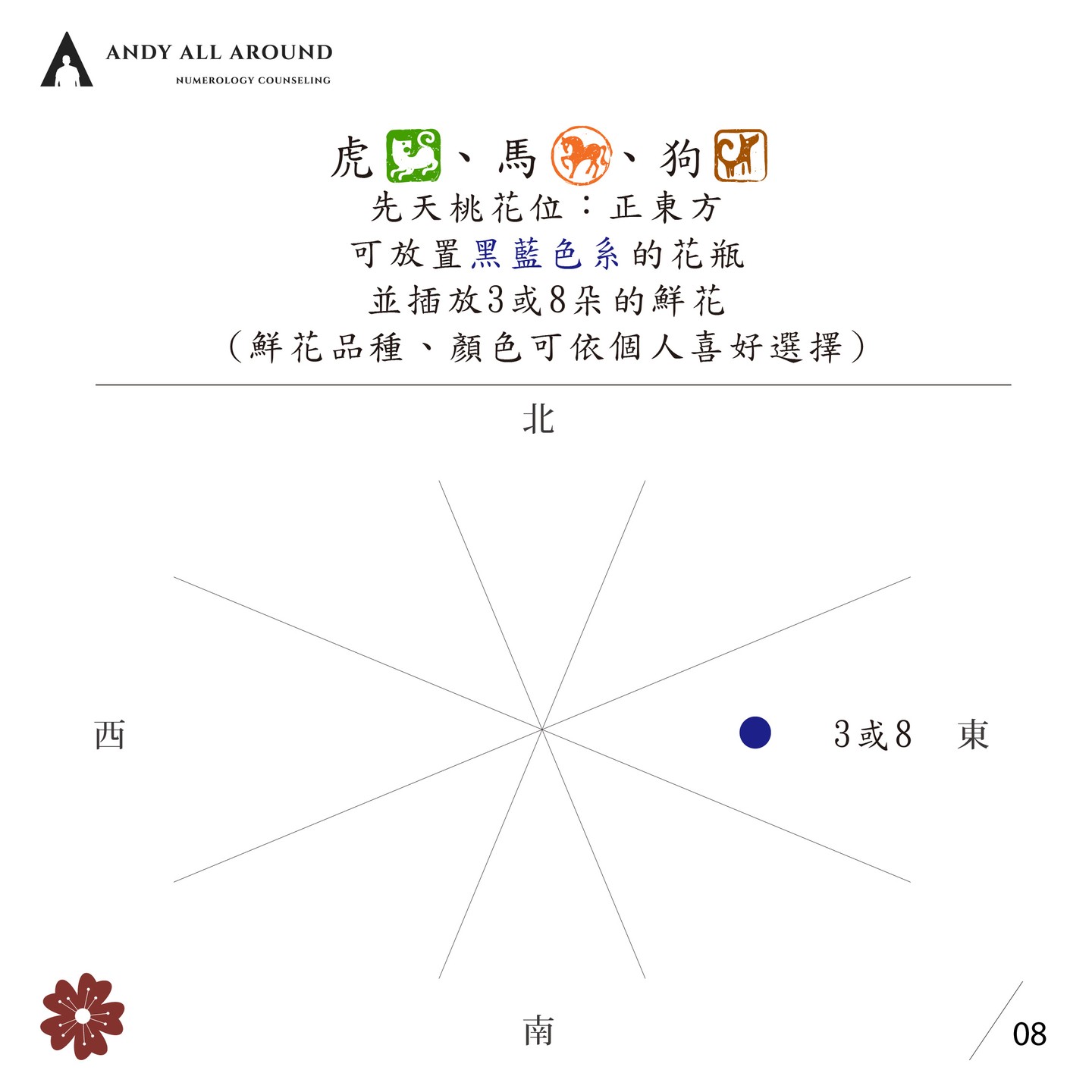 虎年、馬年以及狗年出生的妞妞,先天桃花位的方向為正東方,地支三合為「寅午戊合火」,可以放置藍色、黑色系的花瓶,並插上3朵或8朵的鮮花。