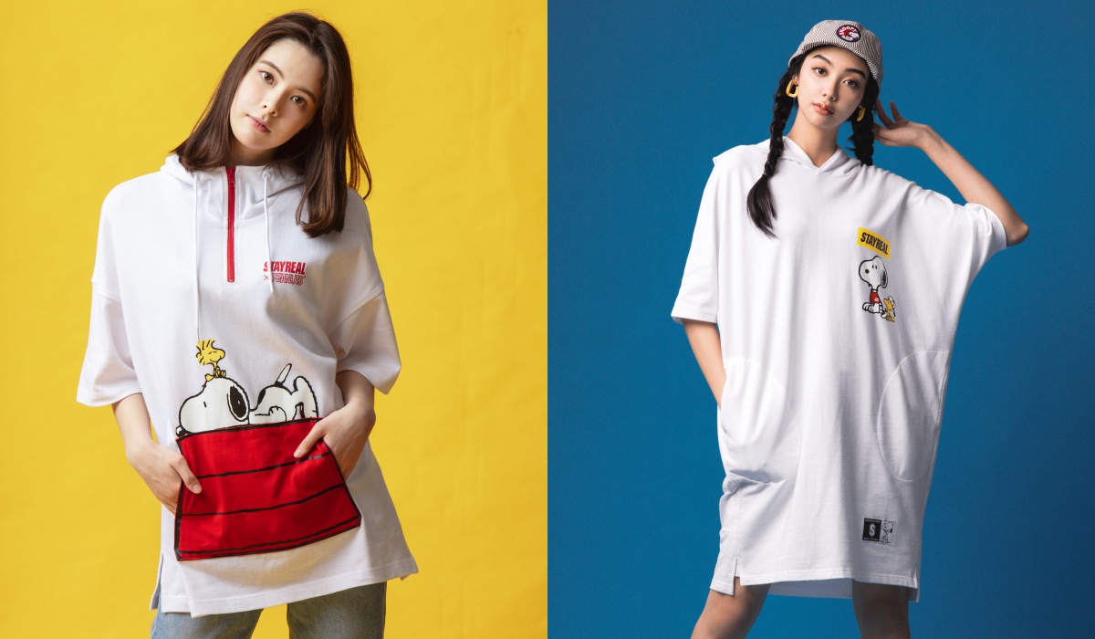這兩款有別於過去STAYREAL的招牌短T,右邊五分袖設計搭配胸前的拉鍊運動領設計,款式很特別,再加上史努比跟他的小狗屋頂,直接變成口袋設計創意十足,另一款則是Oversized的蝙蝠袖設計洋裝,可以直接單穿也可以配上內搭褲或長襪,是很有街頭造型感的單品,很推薦不愛穿T恤的妞妞們選擇喔!