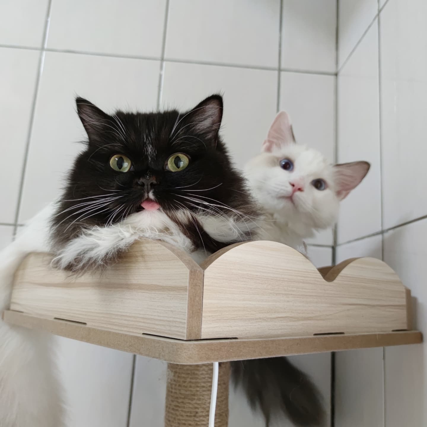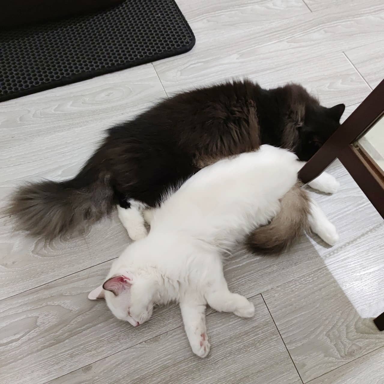 蘿莉和大叔大概只花一個星期的時間,感情就變得超級好,無論到哪都要黏在一起,上廁所也要一起擠,就算沒一起上也會在旁邊排隊輪流上,吃飯也會你一口我一口,沒有護食的狀況,彼此間也會互相舔毛洗澡,每天上演甜寵偶像劇,讓粉絲看了都想叫大雄出來上班啦!