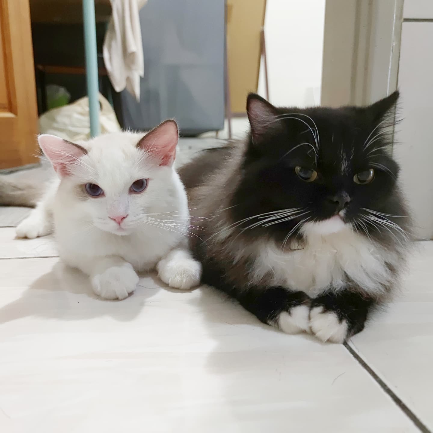 照片裡兩隻可愛的貓咪,黑色母貓叫做蘿莉,白色公貓則是大叔,飼主麻麻分享當初在取名時就想替黑喵取個又萌又可愛的名字,靈光一閃便想到蘿莉,即使未來長歪了也沒關係,反而會有暗黑蘿莉的反差感!
