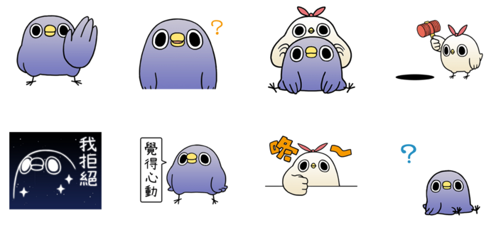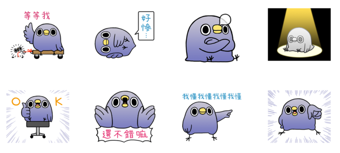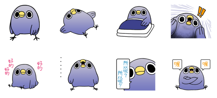 一組二十四張貼圖裡,手機小姐私心最愛最上層左二「不要不要不要不要」那張。看著懶鳥肥肥的身軀賣力甩動纖細的腳爪,實在有夠萌!