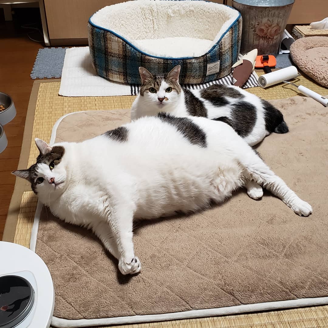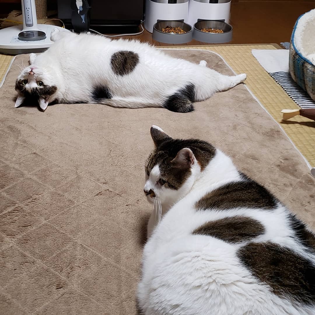 Umi(うみ)&Sora(そら)是一對來自日本的乳牛貓兄弟,分別為9公斤、12公斤,已經稱得上是巨無霸胖貓了!看到牠們虎背熊腰的模樣是不是真的長得很像乳牛呢?(笑)下圖中這塊地墊是牠們最喜歡窩在一起的地方,因為它其實是地熱毯,插電就會發熱,尤其是現在入秋的天氣,貓咪更喜歡溫暖的地方。