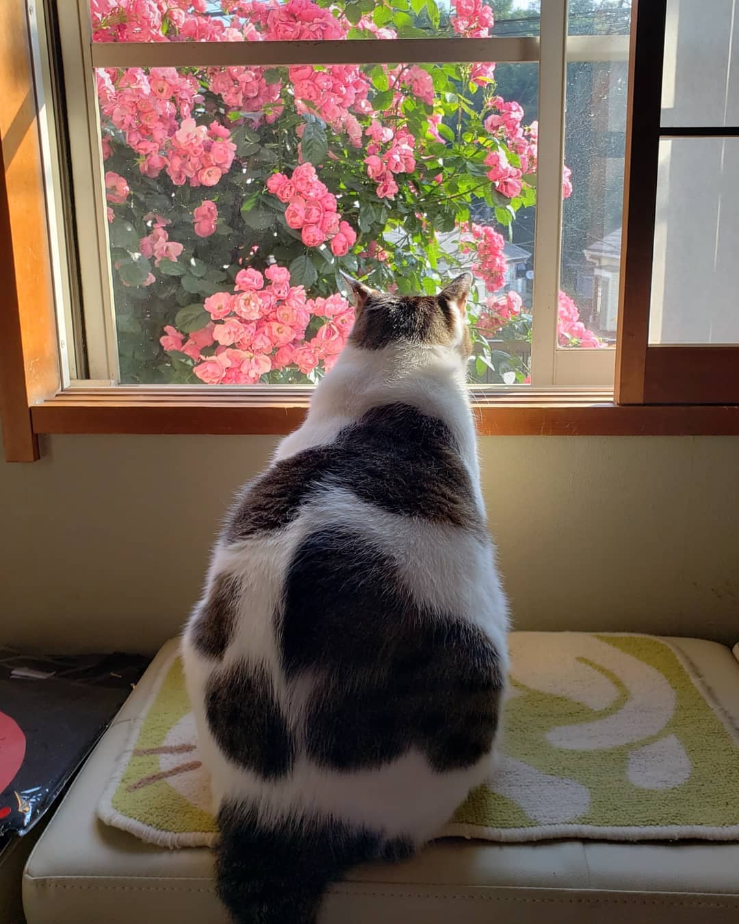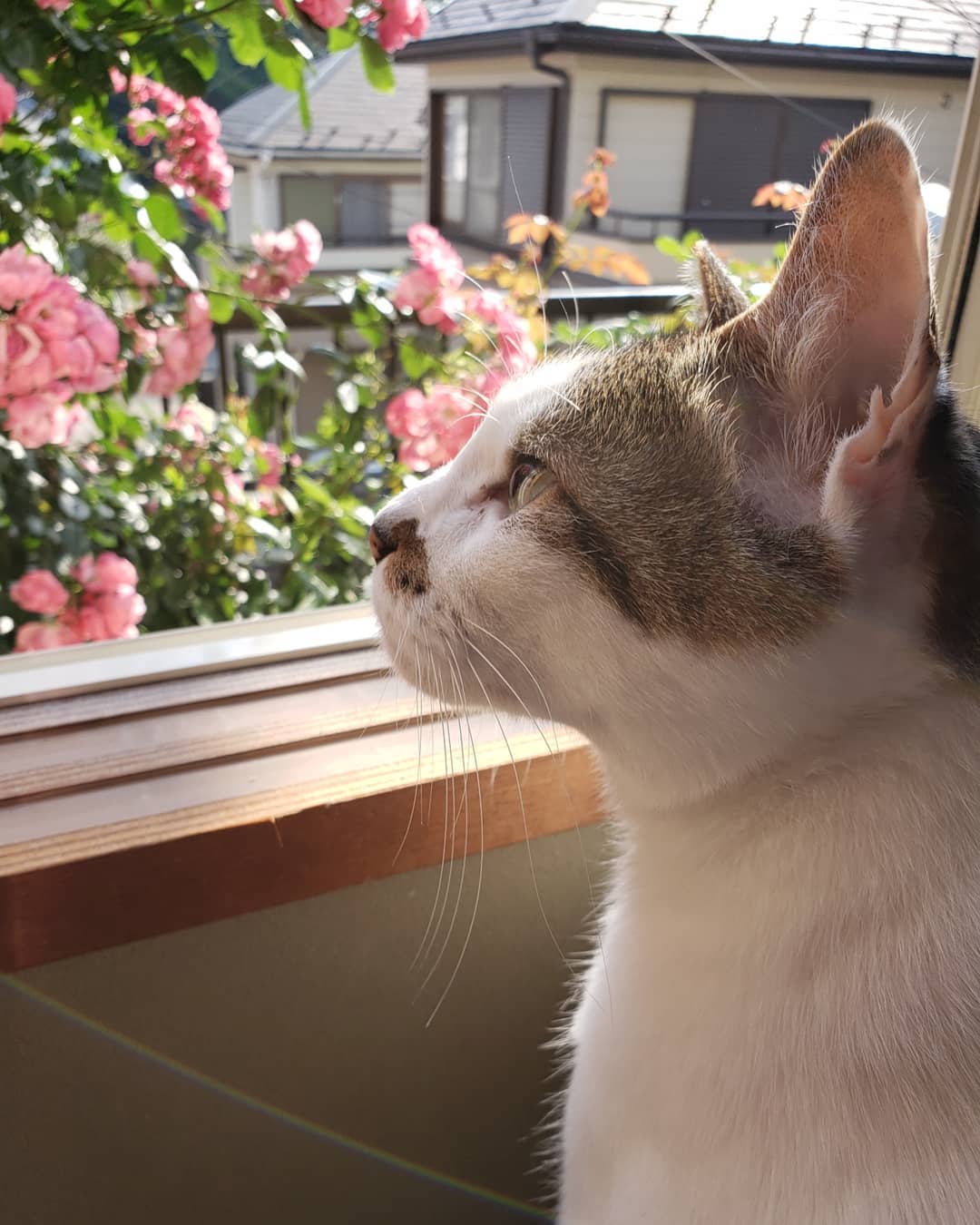 牠們的主人平時喜歡做一些園藝工作,在院子裡時常會種植花草,舉凡是波斯菊、玫瑰、藍莓苗等等都有涉略,相當多元。所以當主人在院子裡修剪花花草草時,兄弟倆就會盯著窗外,可能是在看鳥也可能是真的在賞花(?),看著窗外的側臉真的帥呆了~