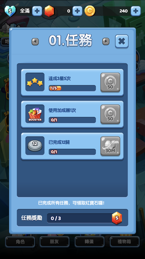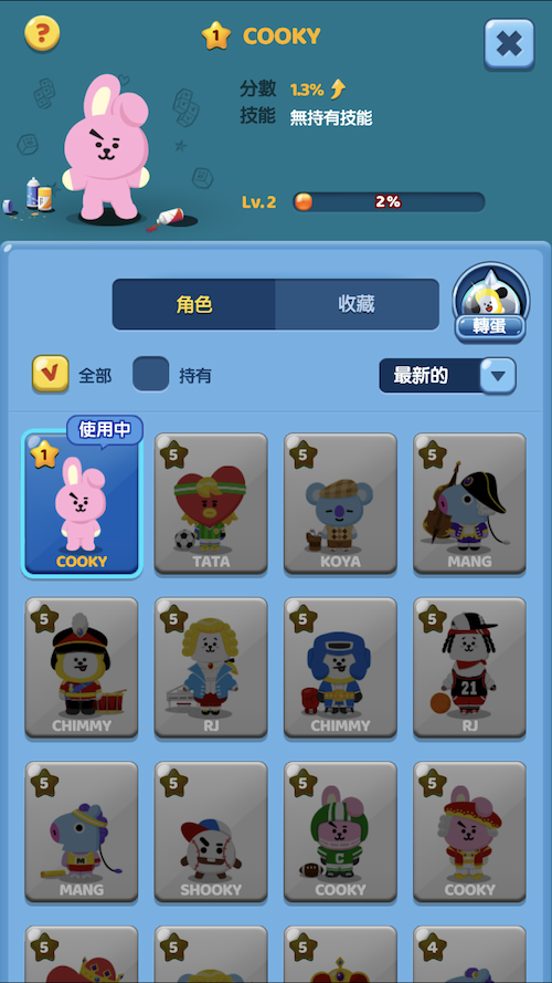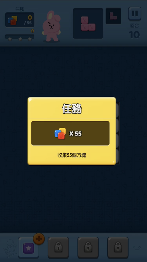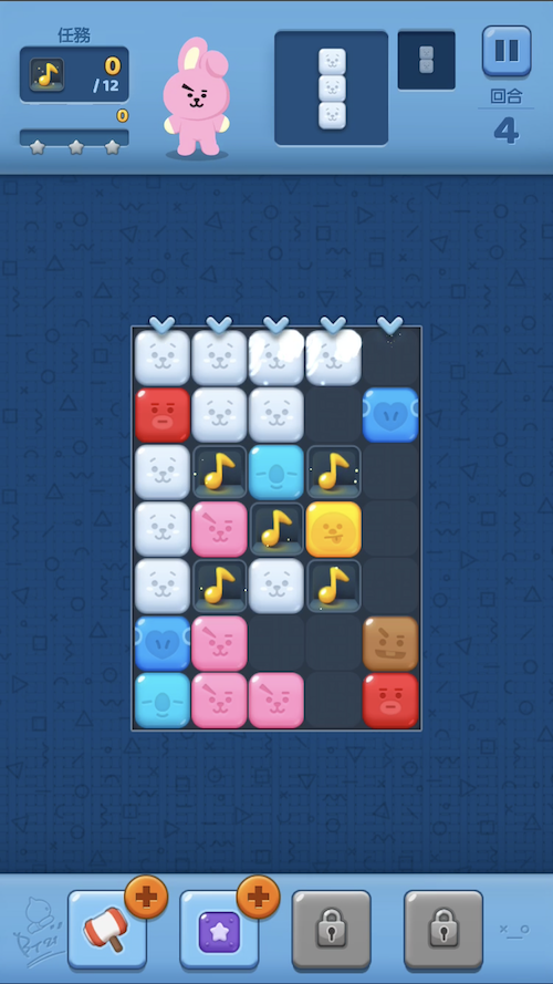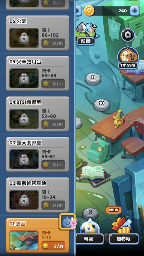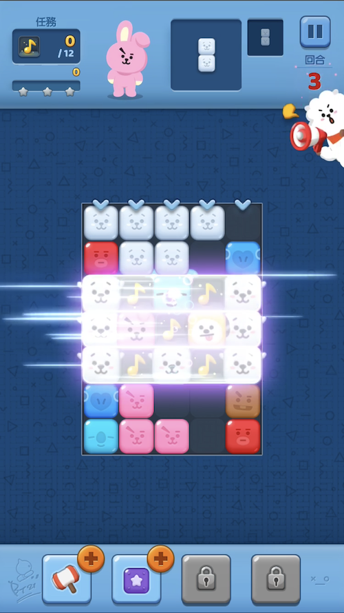 目前總共有10個大關卡、170個小關卡等著你來闖過,而每一大關都會有一個任務,如果順利完成就能得到寶石獎勵!遊戲難度會隨著闖過的關卡增加,到後面會發現其實3星沒有那麼好拿(QQ),但只要想著:解鎖越多關卡並完成任務,就可以利用賺到的錢或寶石抽BT21角色,就讓人很願意堅持下去啊!讓我們一起努力破關,被可愛的BT21包圍吧!