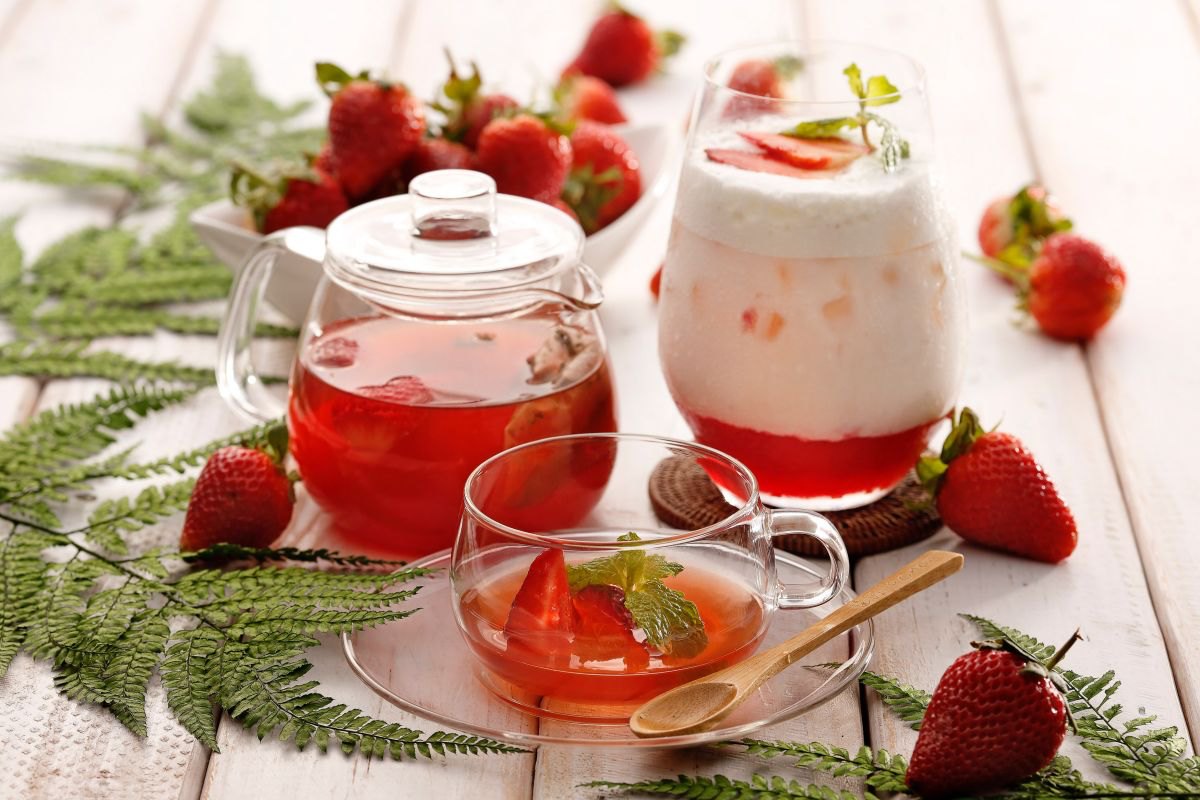 草莓蔓越莓紅酒飲 220元、草莓歐蕾 200元、草莓香檸果茶 180元