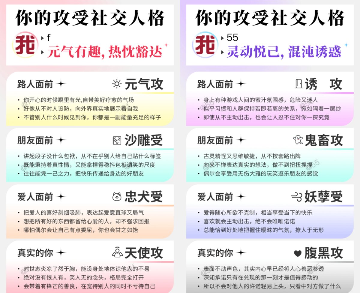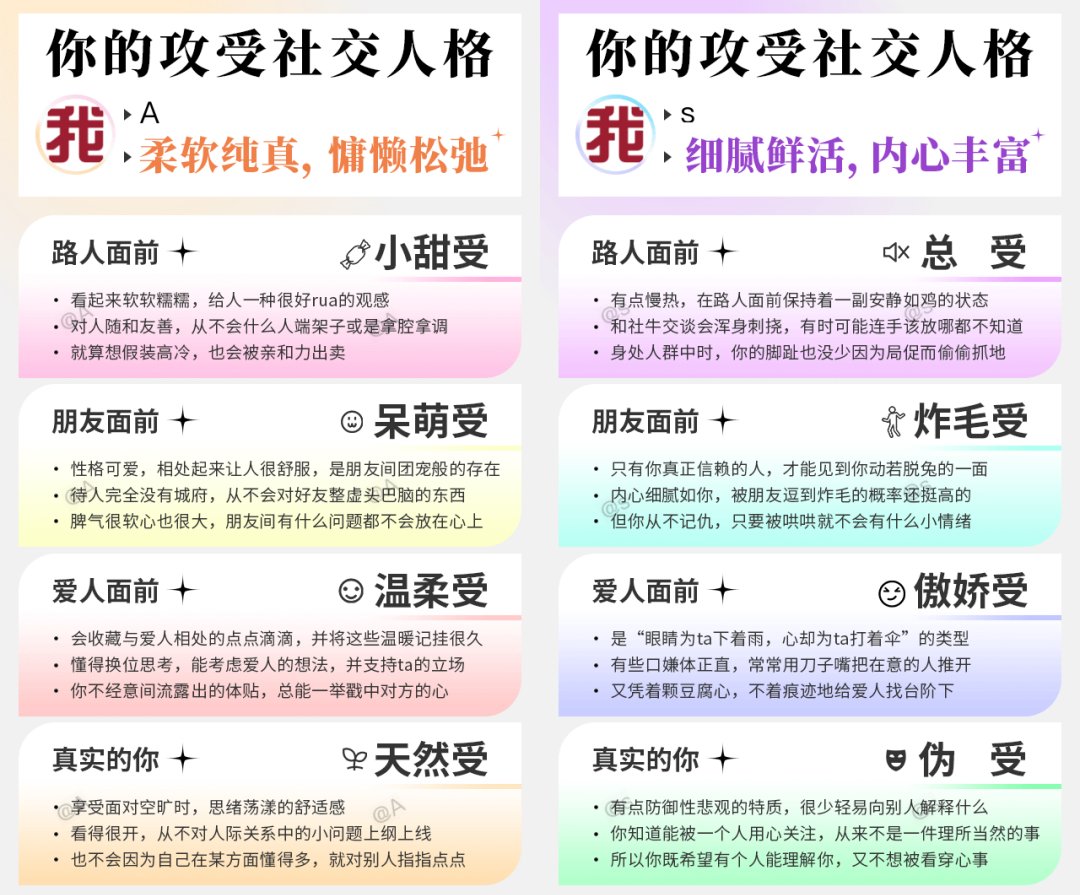解答將會把每個人分成不同的攻受特質,並根據你前面的測驗,一一解釋你在路人、朋友、愛人面前,以及真實的你四種不同人格模樣,有可能四種都是攻、四種都是受,也有機會是裡外人格不同的混合版喔。