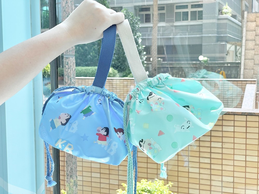 「美耐皿水杯」不止外觀可愛,杯緣與杯底還藏有巧思,喝完水看得到小新與動感小新;「束口袋」結合手提袋設計,一袋兩用,裝個人小物或便當都沒問題;「飲料杯套」推出3種圖案,採「魔鬼氈設計」,能依照飲料杯身調整杯套尺寸。