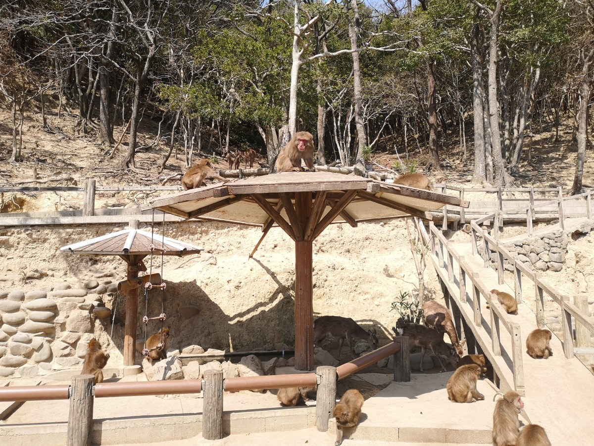 「淡路猴子中心(淡路モンキーセンター)」的特色在於這裡可不是純觀賞的動物園,而是打造一座像猴子的家,三百多隻的小猴子自由穿梭,特別的是通常猴子群居一塊都會有一隻猴老大,而進食時也會由老大先開始,其它小猴子們是不能接近的,但這裡的猴子看起來卻相親相愛,牠們一起享受囊中食物的模樣超療癒!
