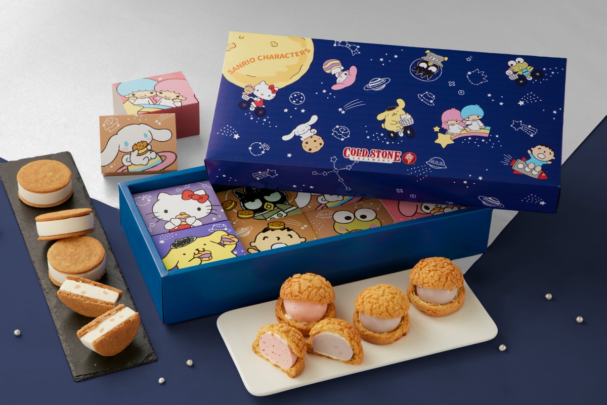 這次推出的「星空漫步」中秋禮盒,三麗鷗大明星們齊聚閃閃月光下漫遊星空的超萌包裝設計,非常適合與家人、朋友一同歡聚賞月時享用,還同步推出「中秋禮盒禮券」,持禮券就能到COLD STONE門市進行禮盒兌換,「以券代盒」贈送親友不僅大大提升送禮的方便性,且誠意依舊滿滿。