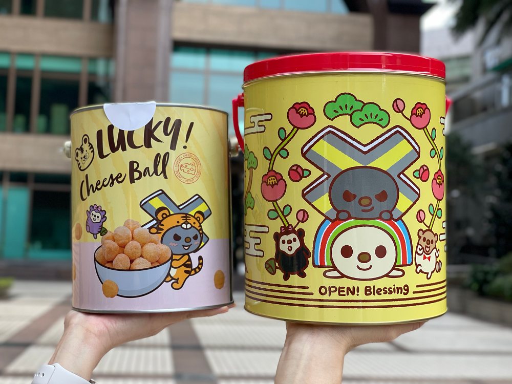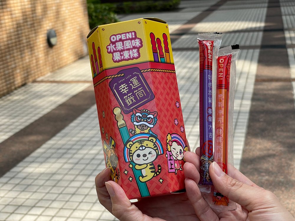 OPEN!家族則帶來歡樂桶、水滴蛋捲、玉米棒等週邊,其中超推妞妞入手「水果風味果凍條幸運籤筒」,包裝上有化身成「老虎」的OPEN!小將,每條果凍都印著吉祥話,很適合過年大家一起試手氣。