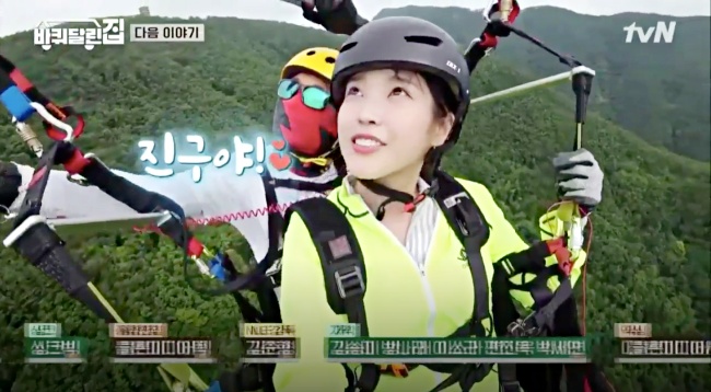 讓呂珍九緊張的人來了!(笑)畫面中看到我們牛奶肌膚女神,頂著幾乎素顏的淡妝、提著行李登場,一來就看著呂珍九做菜,接著兩人居然去挑戰「飛行傘」,分別飛上高空之後,還不忘互相甜喊對方,呂珍九大喊:「姊姊~」IU馬上回應:「珍九啊~」(吼你們當教練不在嗎XD)