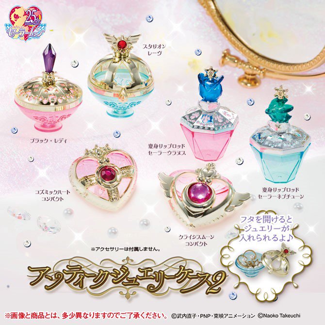 美少女戰士古董珠寶盒扭蛋第2彈即將在近期上市啦~這次不只有小兔的變身寶盒,還有小小兔聖杯、天王星、海王星等人的變身器,大小為5.7公分左右,用來放耳環、戒指之類的小飾品剛剛好。而且售價只要300日幣,整組全收也很可以啊!超精緻的設計,不管扭到哪個都不會生氣,好想在化妝台上擺滿一整排!