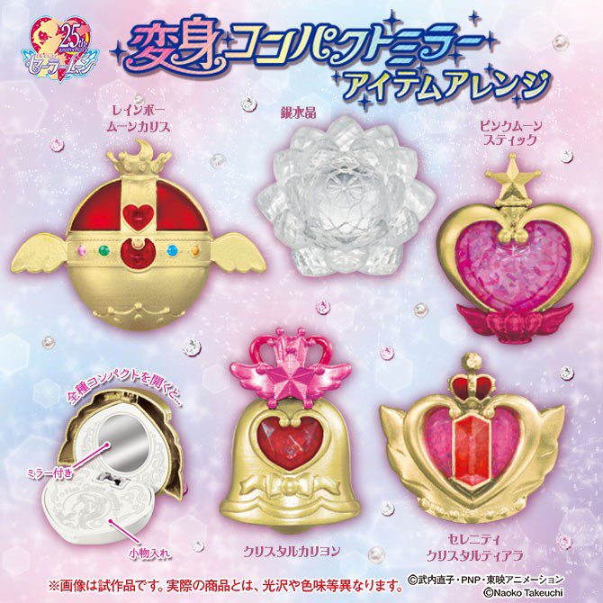 再來這個變身器鏡子要等到8月才會上市,這次除了有銀水晶、聖杯的造型之外,還有小小兔的粉紅月亮神杖跟比較少見的水晶聖鈴,以及倩尼妮迪女皇的水晶皇冠造型!這款系列扭蛋除了可以幫成鏡子之外,下方還可以收納小物,很適合帶出門吶!(只是如果要光明正大拿出來用需要一點勇氣...)