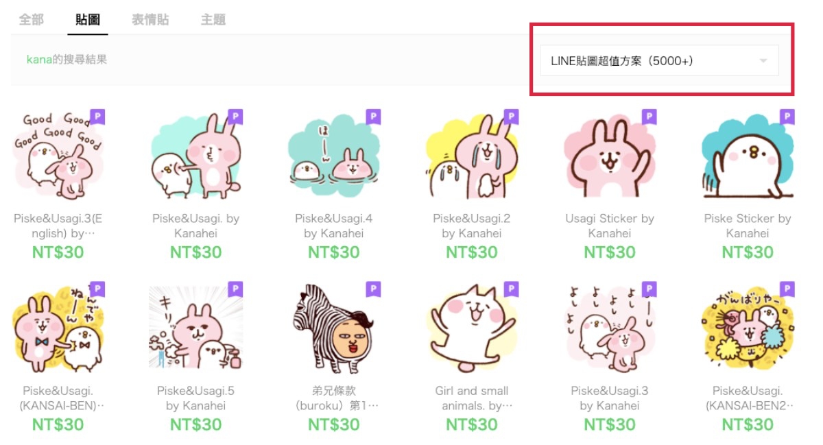 除了上述介紹的角色之外,卡娜赫拉多款英文、日文貼圖也支援用飽飽專案,可以盡情使用粉紅兔兔與P助。挑選貼圖時除了從專頁物色之外,若妞妞們有喜歡的角色,也可搜尋關鍵字進入貼圖清單,點選右上角的選單「LINE貼圖基本/方案」,藉此任意挑選。(p.s.若沒有出現選單,代表未支援)