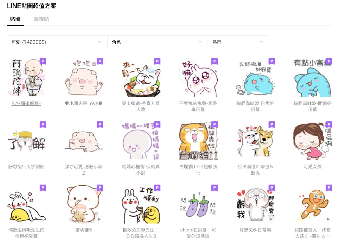 加值「貼圖用飽飽」後,只要是右上角標記「紫色P字」的貼圖(或表情貼)都能免費使用,可直接到「LINE貼圖基本/超值方案」挑選喜歡的貼圖,下載後隨選隨用。需注意的是,基本型專案可同時持有5組貼圖;超值型專案則能同時持有1000組貼圖。(都是「免費下載」沒錯,但基本型的用戶在貼圖收藏箱內,只能同時擁有5組指定貼圖)