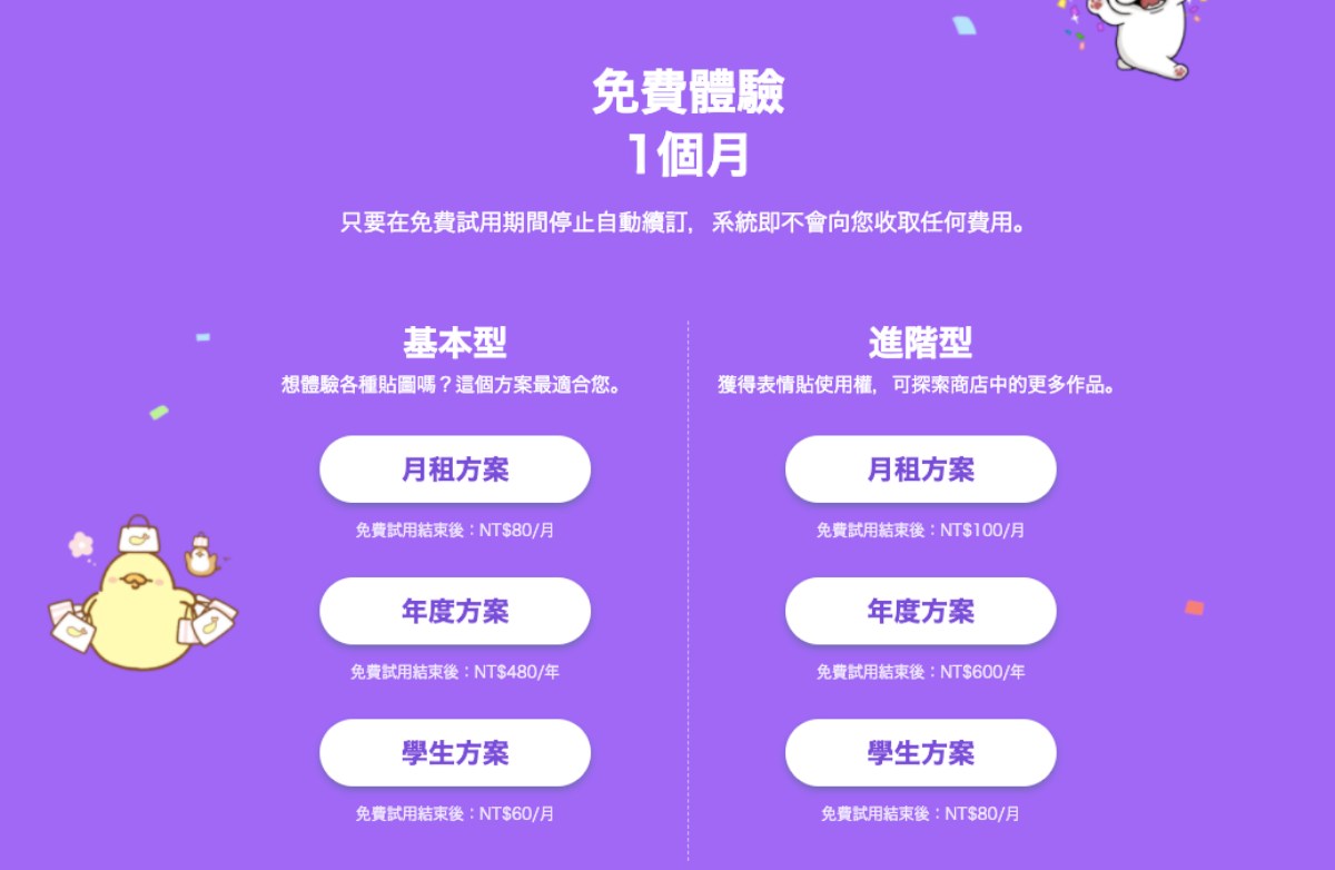 LINE「貼圖用飽飽」共有月租、年度與學生3種方案,「基本型」價格80元起,可使用400萬組以上貼圖,「進階型」售價100元起,除了貼圖外,還加碼超過5萬組的表情貼,且不需擔心花了錢卻沒在用這個服務,妞妞們可先「免費體驗1個月」,再決定是否續訂。
