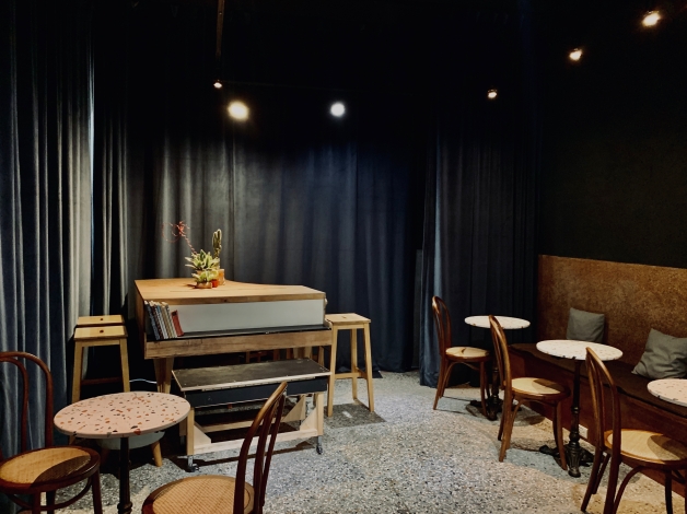 整棟建築外觀是一棟老宅,一樓是「Manni Café 很多咖啡」,而姊妹店「Verde 綠境」則隱藏在三樓,最特別的地方是咖啡廳有一區有座木製的「鋼琴座位區」,是去年歌劇院音樂劇來台巡演時的道具,除此之外,前半部的牆面是白色,後半部則是黑色,主要是因為當有活動時現場的窗簾關起來會變成劇場的黑盒子,成為一個不會漏光的舞台,搖身一變成演出場地!
