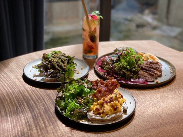 鴨胸沙拉 $360、威士忌脆培根麵包堆 $180、青醬雞肉沙拉麵包堆 $180