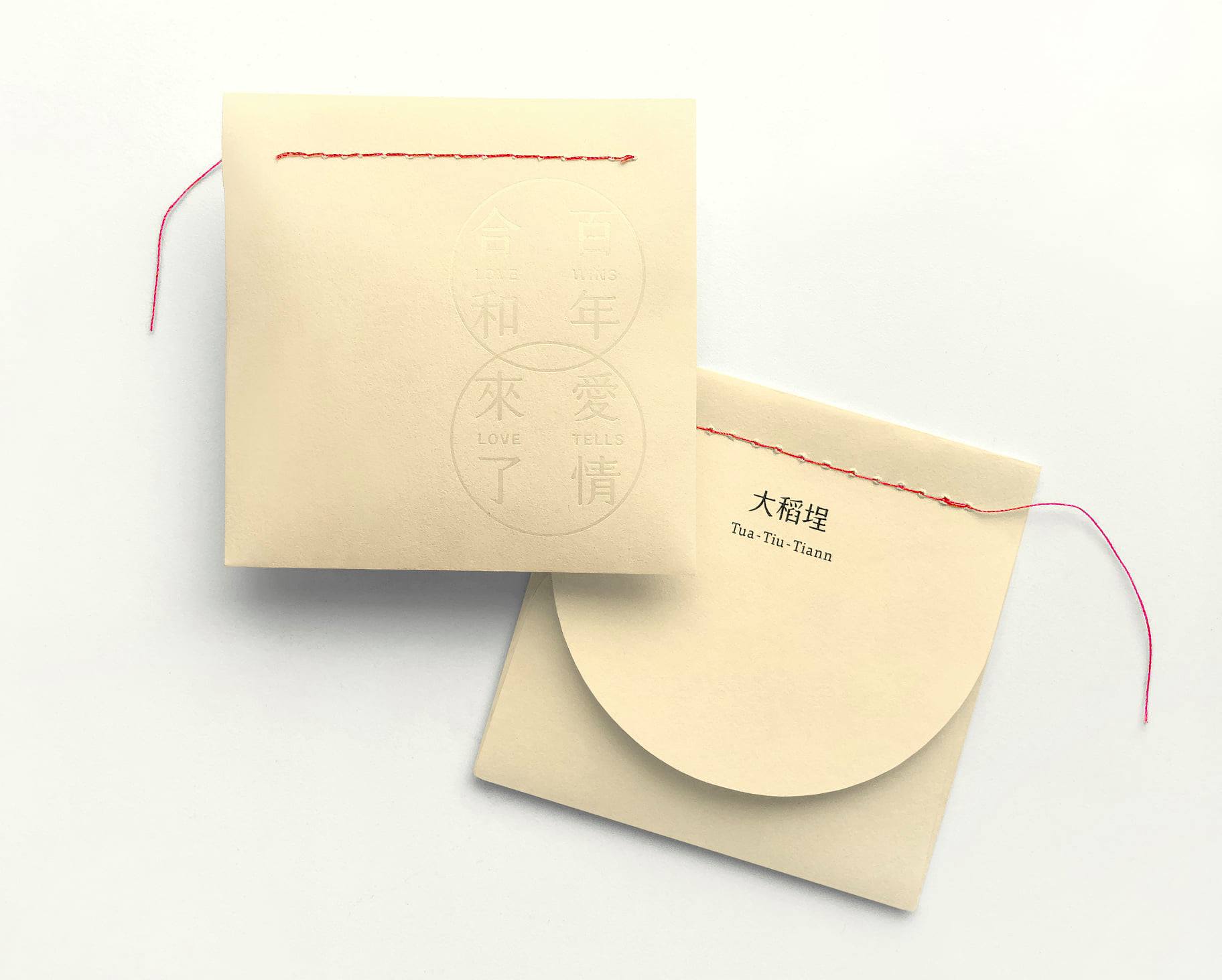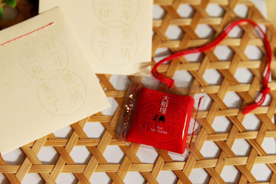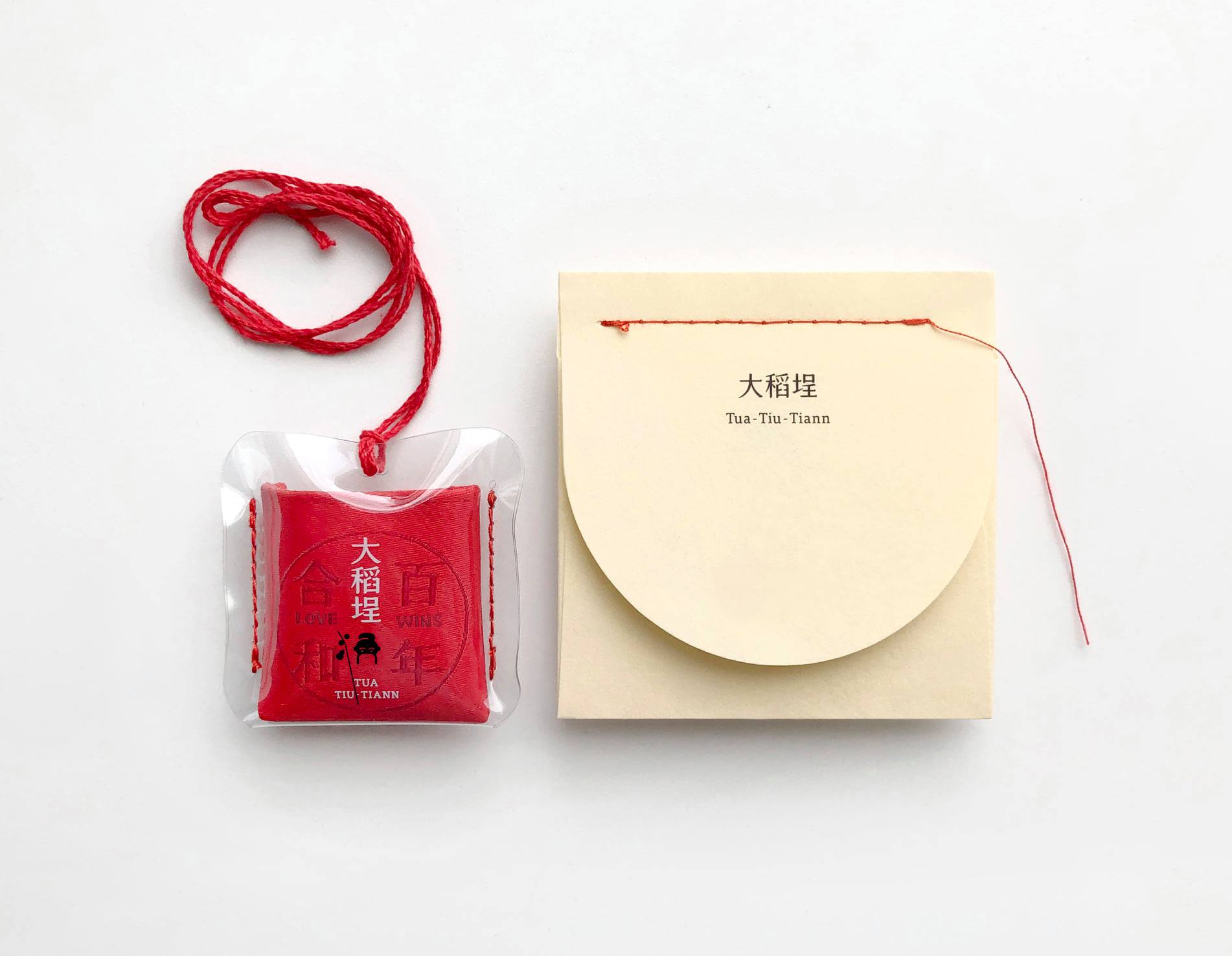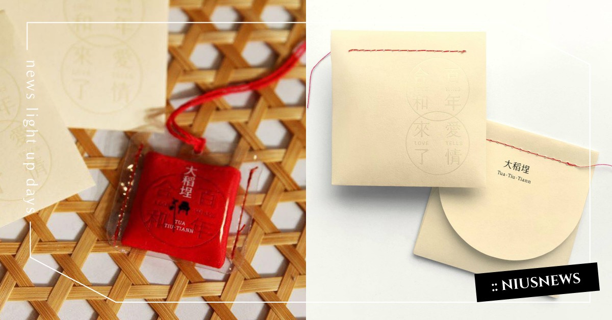 這款月老祈福香袋從內到外都充滿設計巧思,金色的包裝鑲著代表姻緣的紅線,上頭還印有利用「凝書體」寫上的「愛情來了LOVE TELLS」與「百年合和 LOVE WINS」,而開口那面則是寫著「大稻埕」,和一串英文字「TUA TIU-TIANN」,唸出來以後才發現竟然是「大稻埕」的台語羅馬拼音呢!