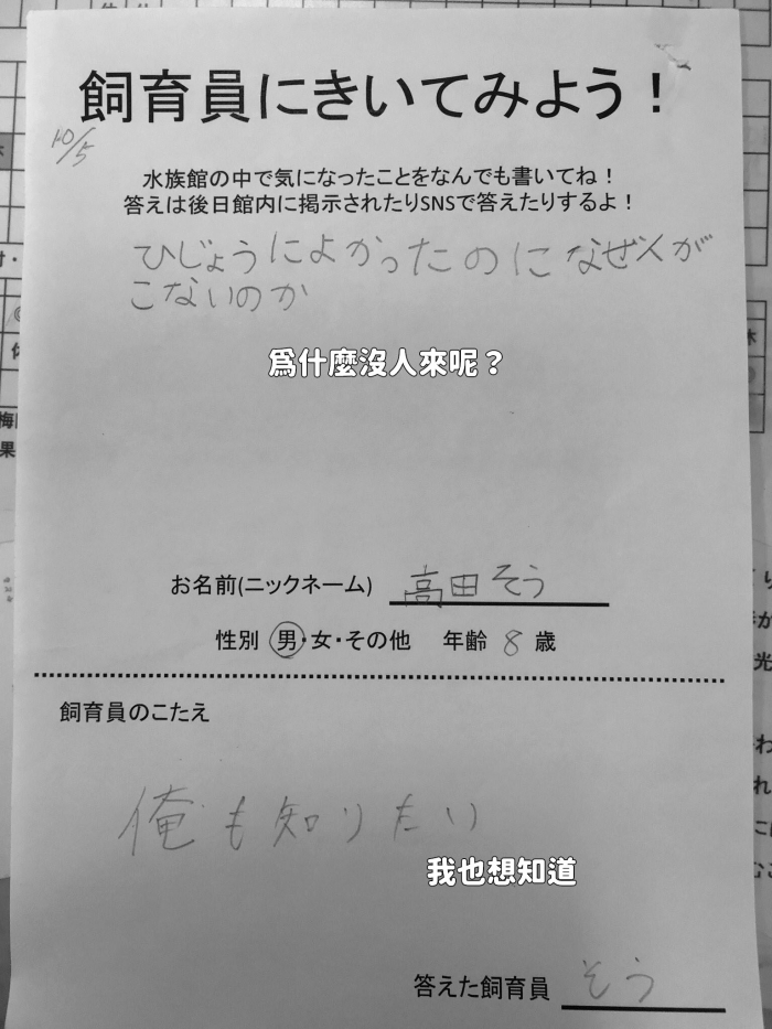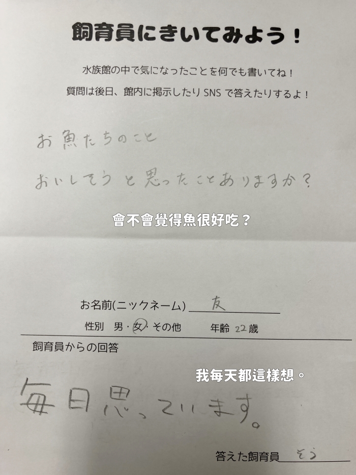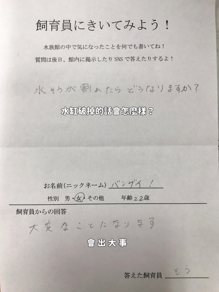 看來22歲的遊客好奇心都十分旺盛(笑),這位遊客向水族館提問:「水缸破掉的話會怎麼樣?」而飼育員嚴肅中帶點搞笑的回覆「會出大事」,如果把問卷發給飼育員,讓他們對來水族館玩的遊客提問,感覺紙上會寫著:「請問你們腦海裡都在想啥?」
